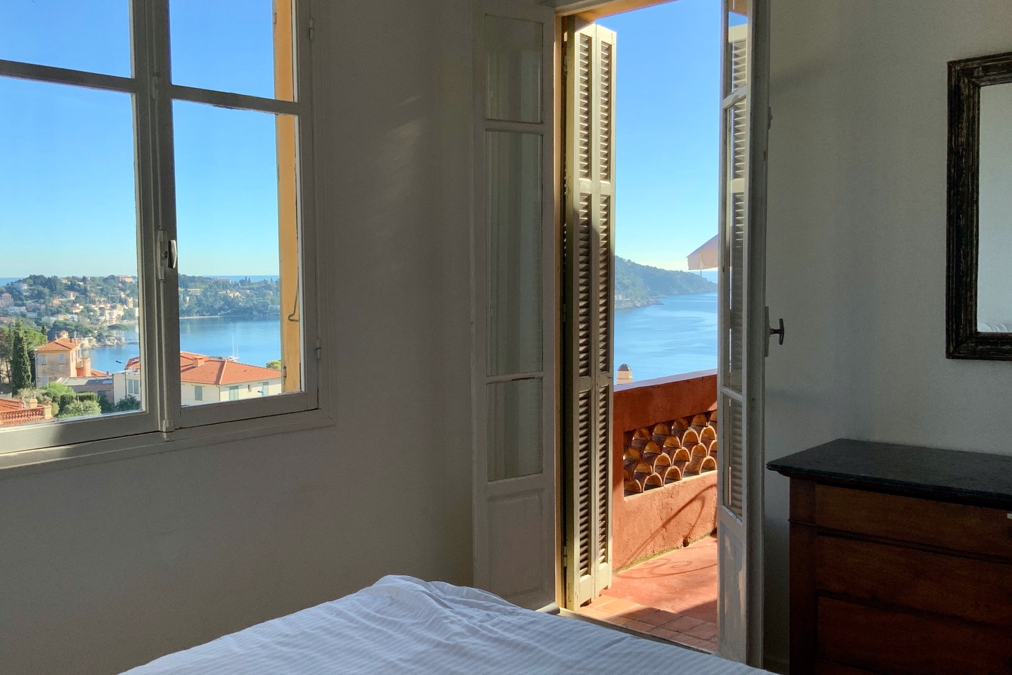- On the 2nd floor, 2 bedrooms with en-suite bathroom and shower room. The 2 rooms benefit of a beautiful light and dominate the sea like the rest of the house. A small common terrace gives an access to the outside.