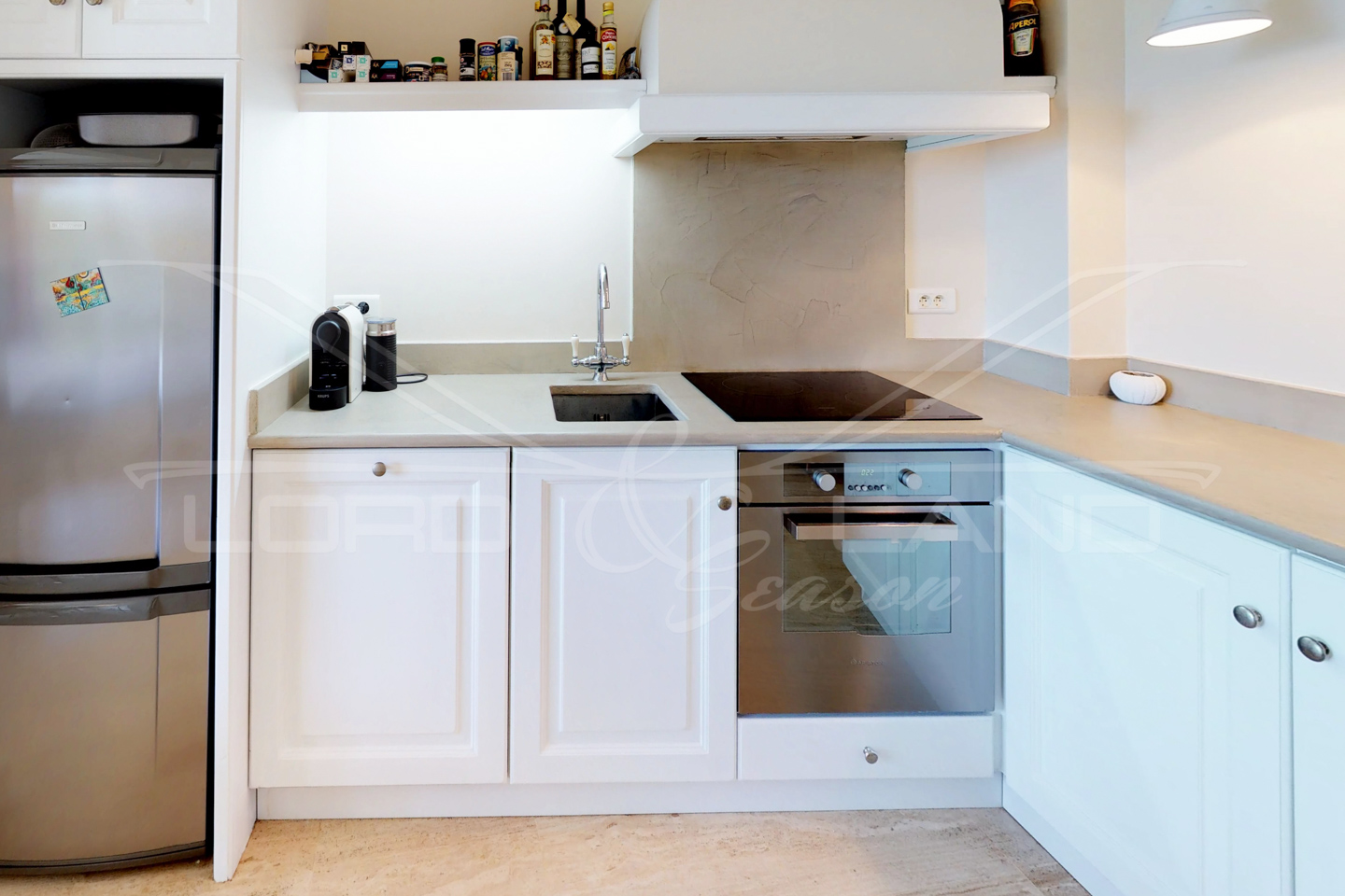 On the ground floor, the villa offers a nice and bright living room with american kitchen dining area and open fireplace, on a pretty garden of 120m² with a magnificent sea view. A bedroom with shower room.