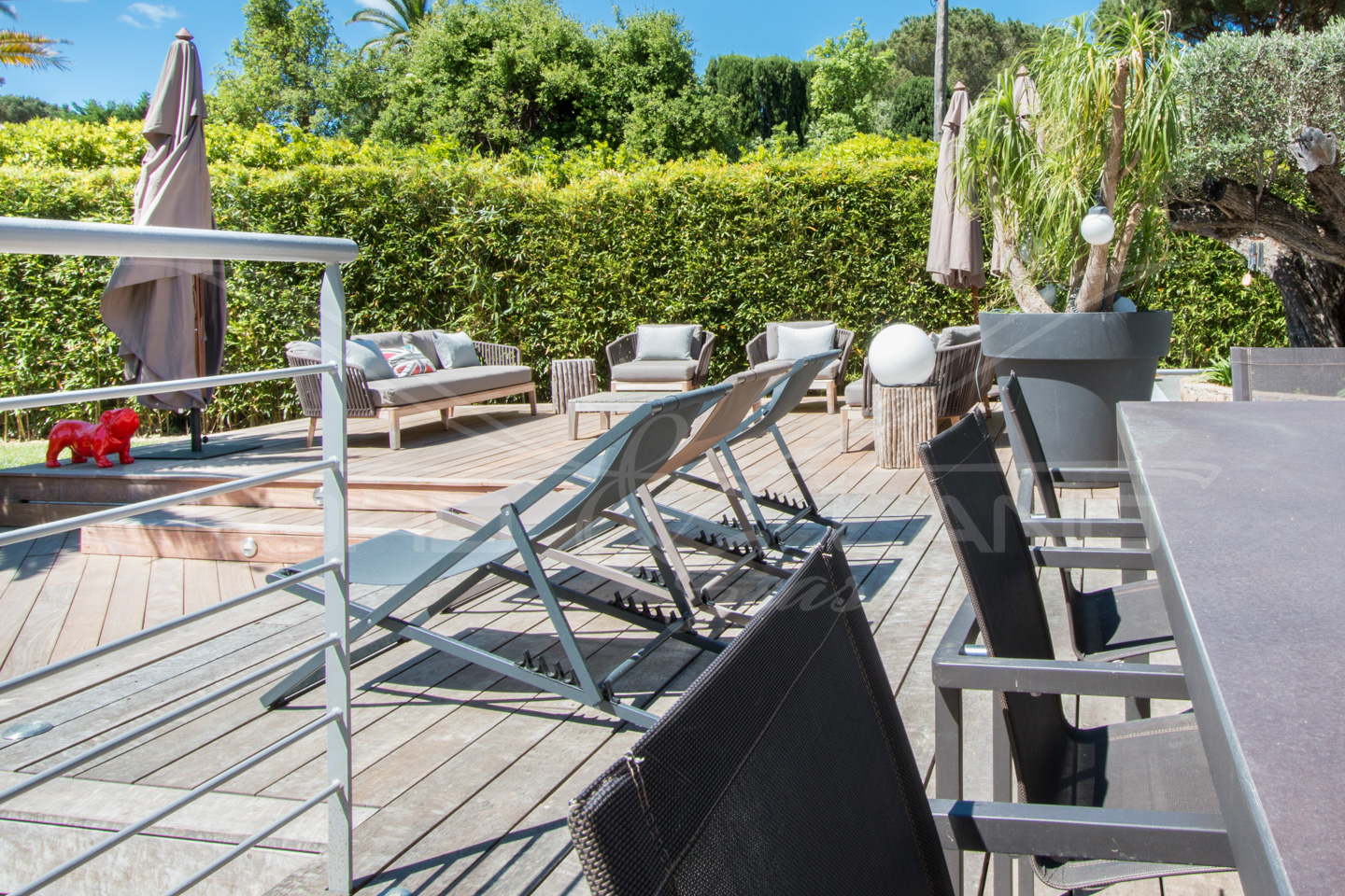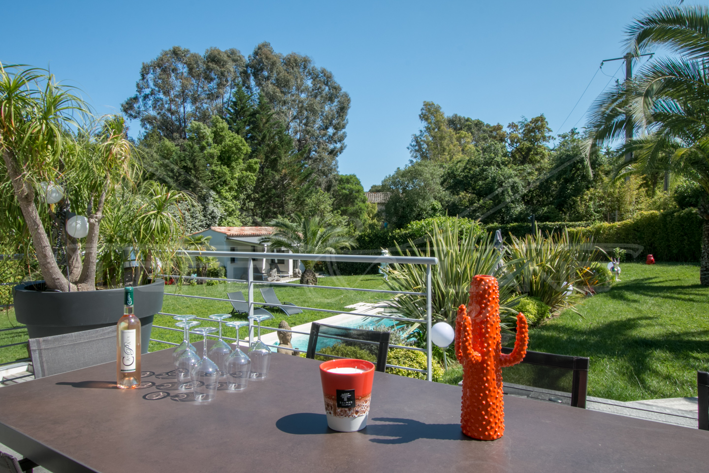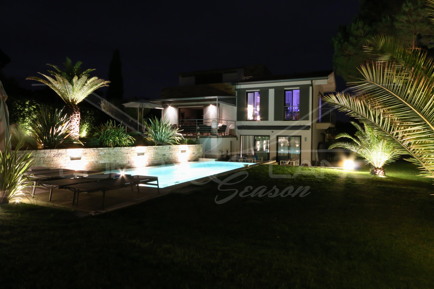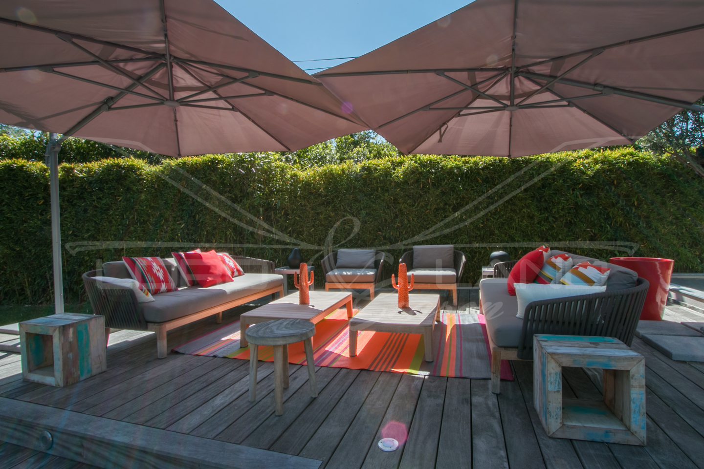 Air-conditioned contemporary villa of 220sqm. The house offers 5 beautiful bedrooms (including a totally independent outdoor guest house), each with its TV, its bathroom with toilet and bidet. Magnificent living space of 80sqm. Two terraces and a beautiful swimming pool.