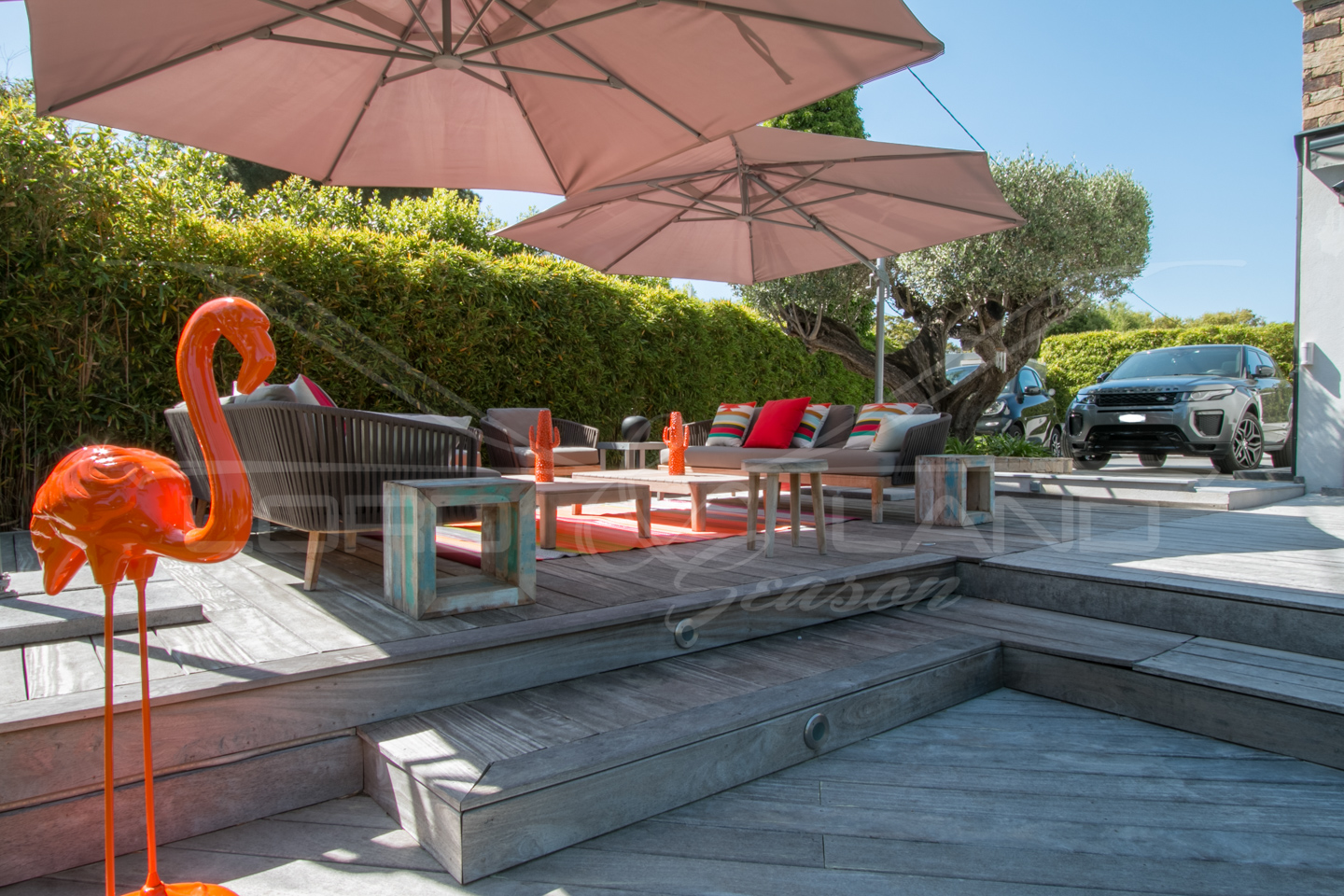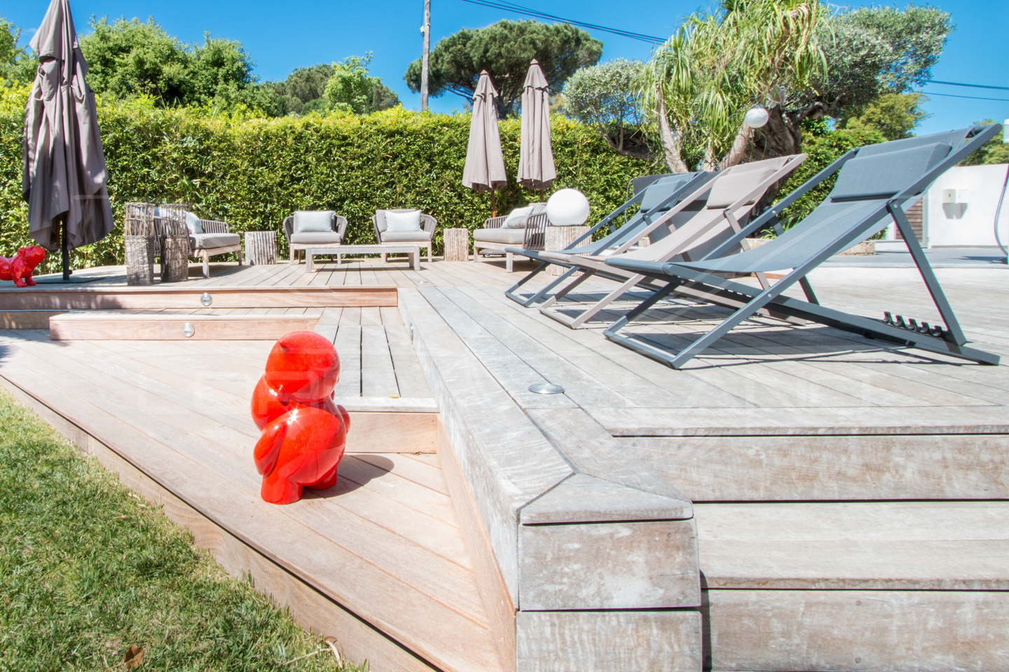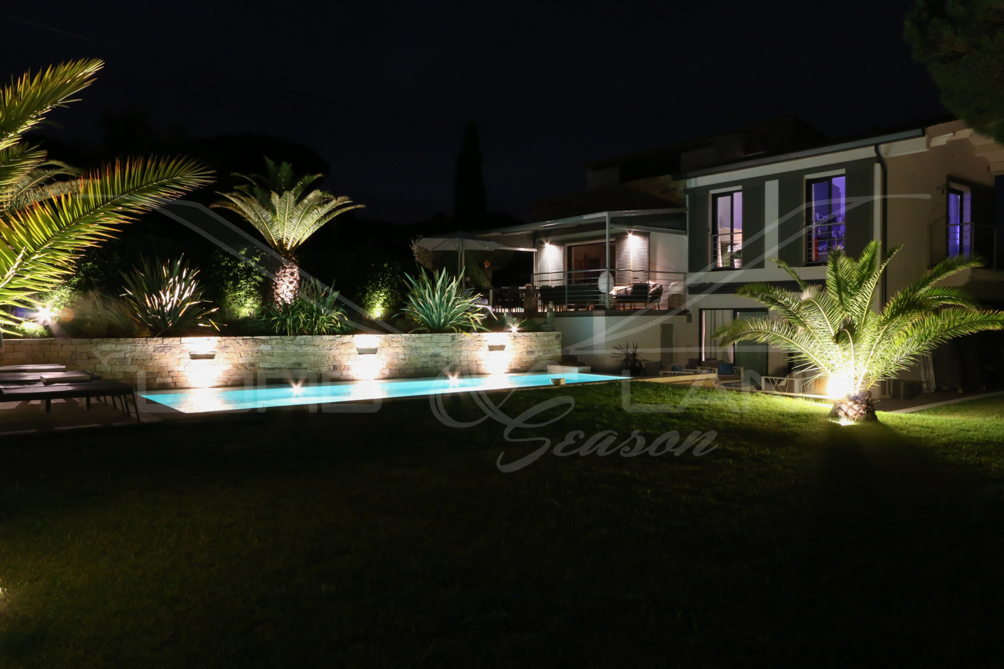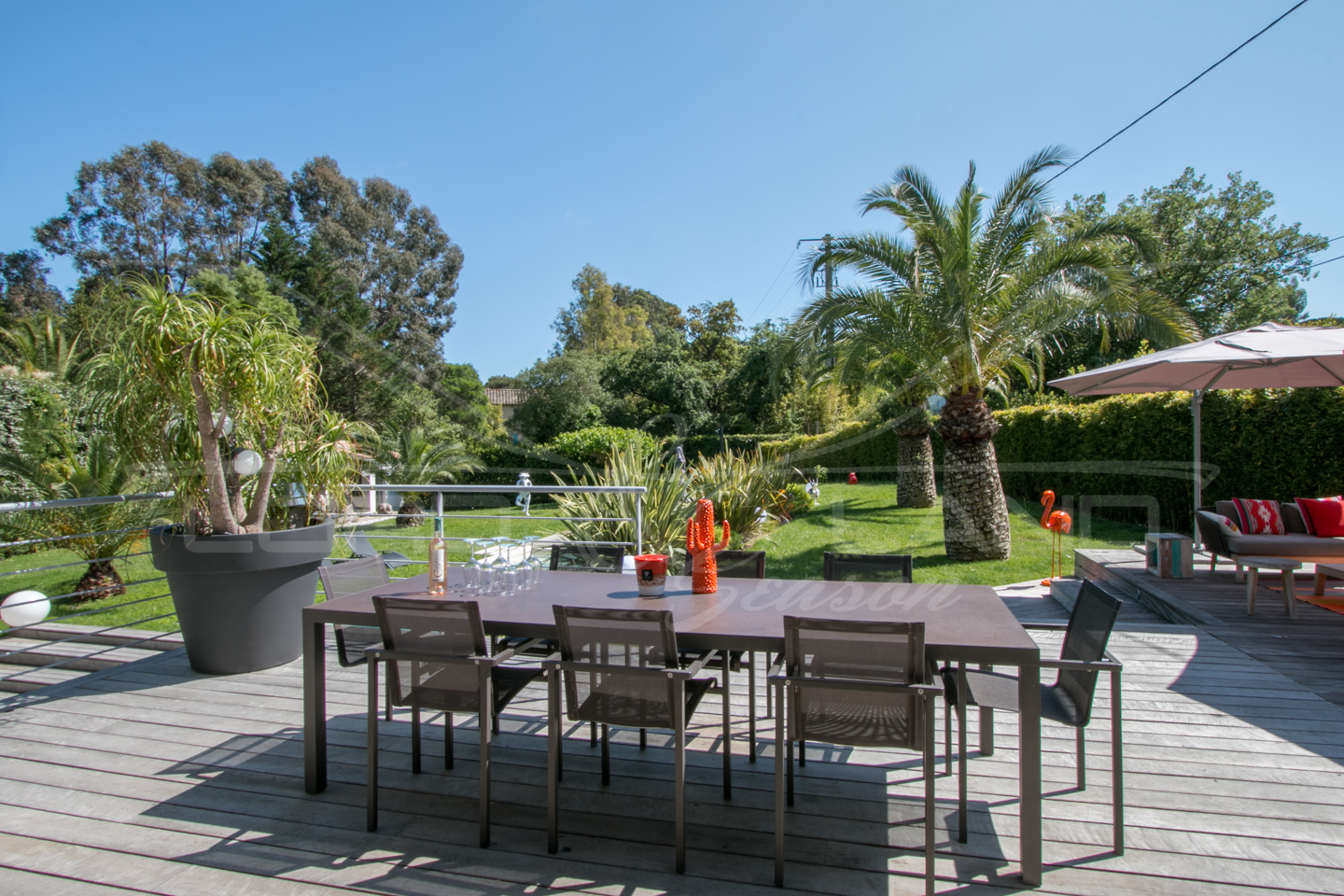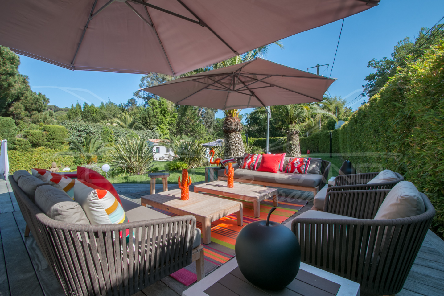 Air-conditioned contemporary villa of 220sqm. The house offers 5 beautiful bedrooms (including a totally independent outdoor guest house), each with its TV, its bathroom with toilet and bidet. Magnificent living space of 80sqm. Two terraces and a beautiful swimming pool.